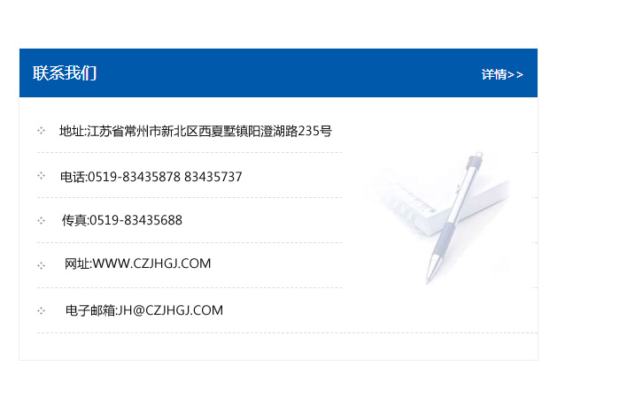 傳真:0519-83435688    郵編:213135    網址:WWW.czjhgj_com.pingandujia.com    電子郵箱:JH@czjhgj_com.pingandujia.com